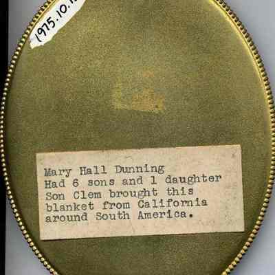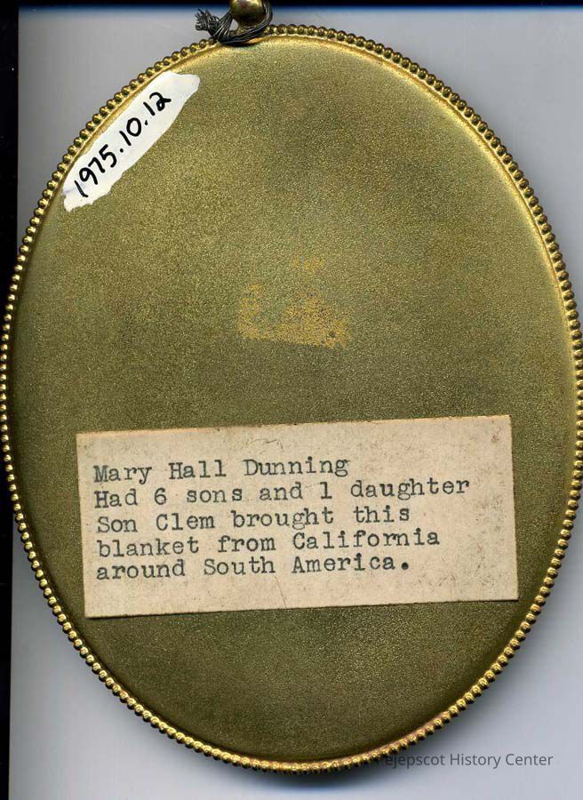 A painted portrait photograph of Mary Hall Dunning in a gold oval frame 4"x 5". On the back the note reads: "Mary Hall Dunning. Had 6 sons & one daughter. Son Clement brought this blanket from California around South America." Undated.