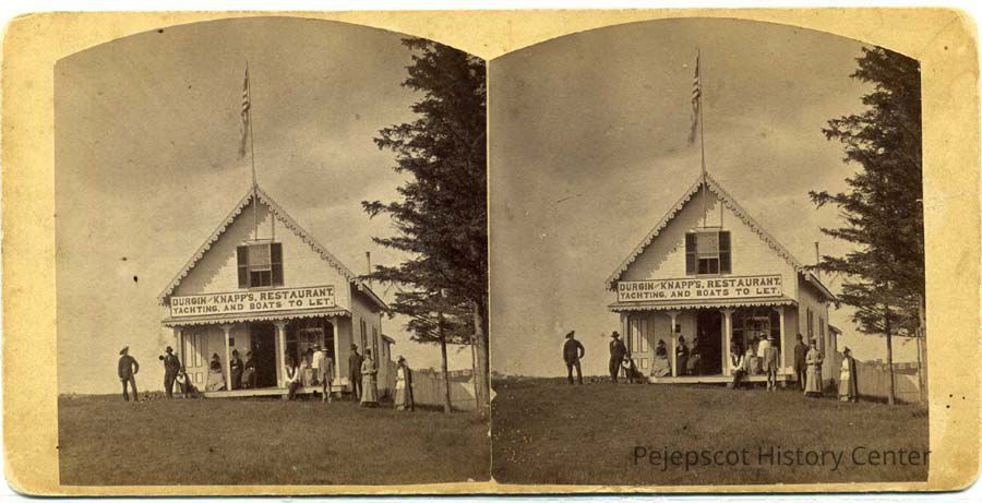A stereopticon view of Durgin & Knapp's Restaurant in Harpswell with "Yachting and Boats to Let" sign. Charles Knapp and Paul Durgin built the restaurant in 1876-76. It was moved and modernized into two collages in the 1890's.