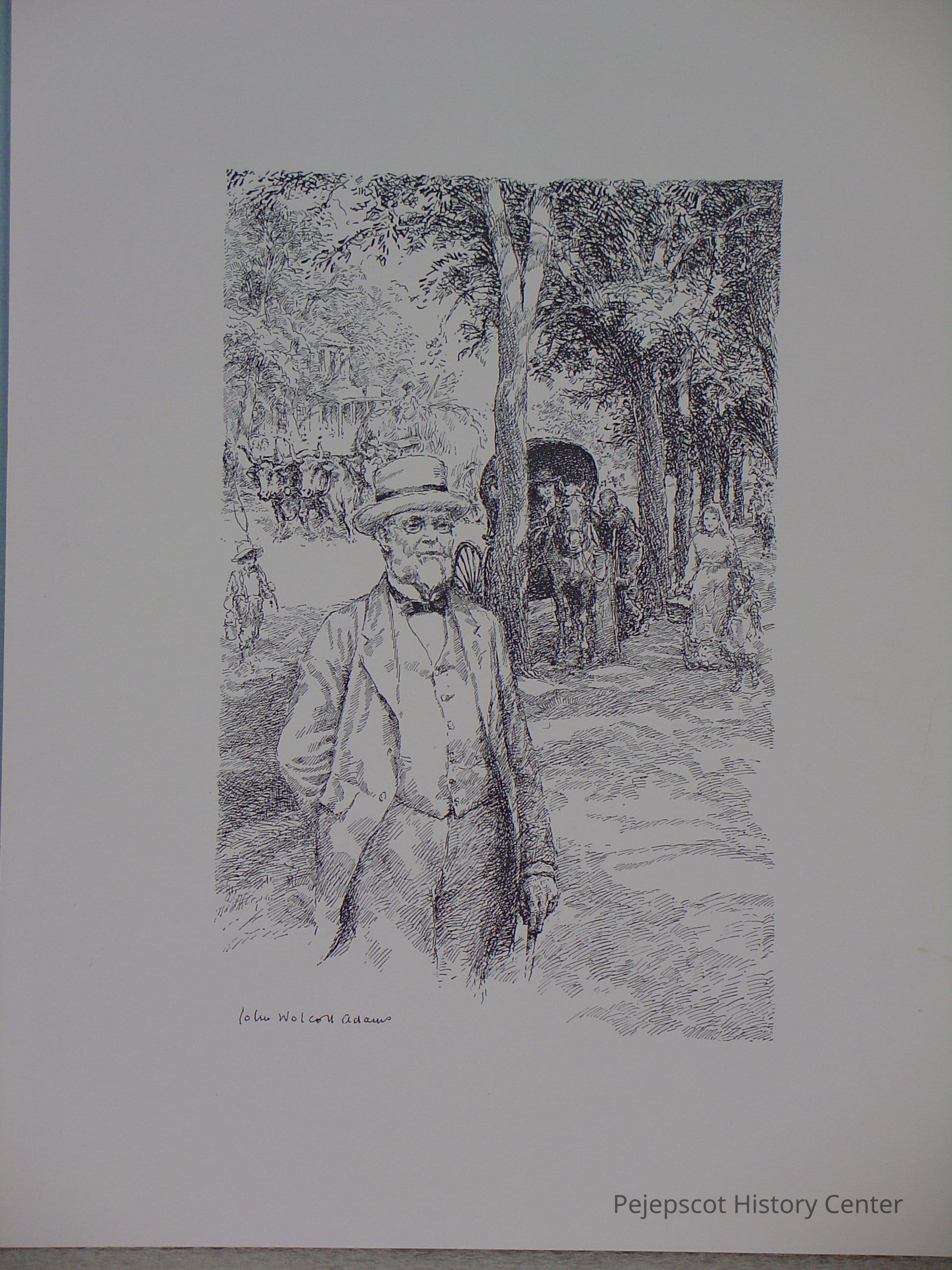 Unframed B&W print of E. W. Dennison in white hat, stand-up collar, bow tie, vest , three-quarter length open coat and cane strolling on a tree lined walk, by John Wolcott Adams.