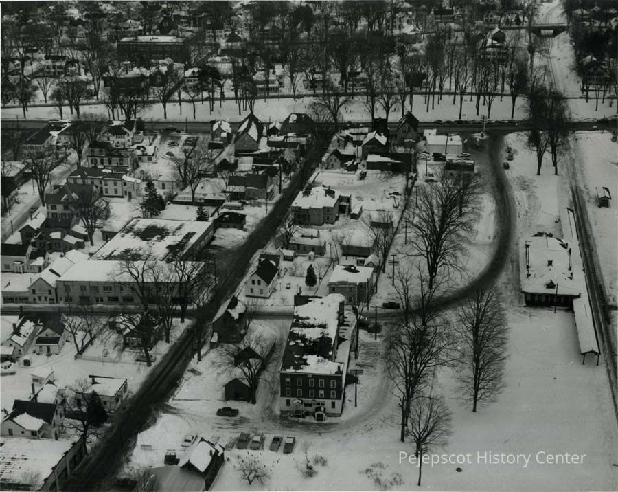 A B/W aerial photograph of the Eagle Hotel and the area that is now the Hannaford Supermarket parking lot. Taken looking towards Maine Street, Brunswick, ME. Undated.