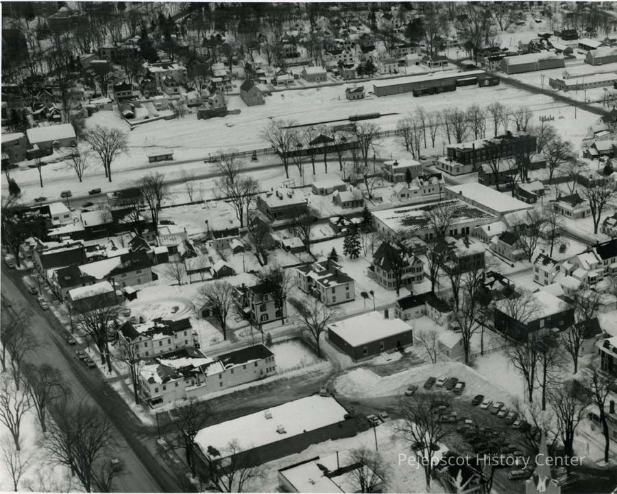 A B/W aerial photograph of the Eagle Hotel and the Brunswick Train Station, Brunswick, ME. The photo was taken looking south. Most of this area is now the Hannaford Supermarket parking lot. Undated.