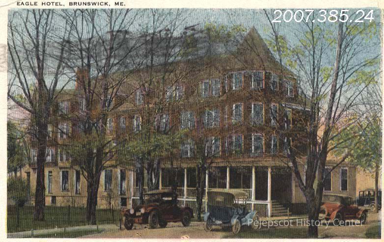 A picture postcard of the Eagle Hotel, Brunswick, Maine, with three vintage cars in front. The card is postmarked July 7, 1924 (?) and has a 1 cent stamp attached.Lexicon