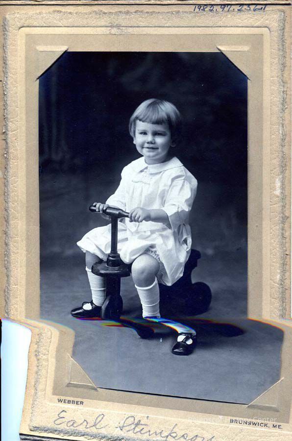 Black & white photograph of Earl Stimpson as a young child sitting on a scooter.