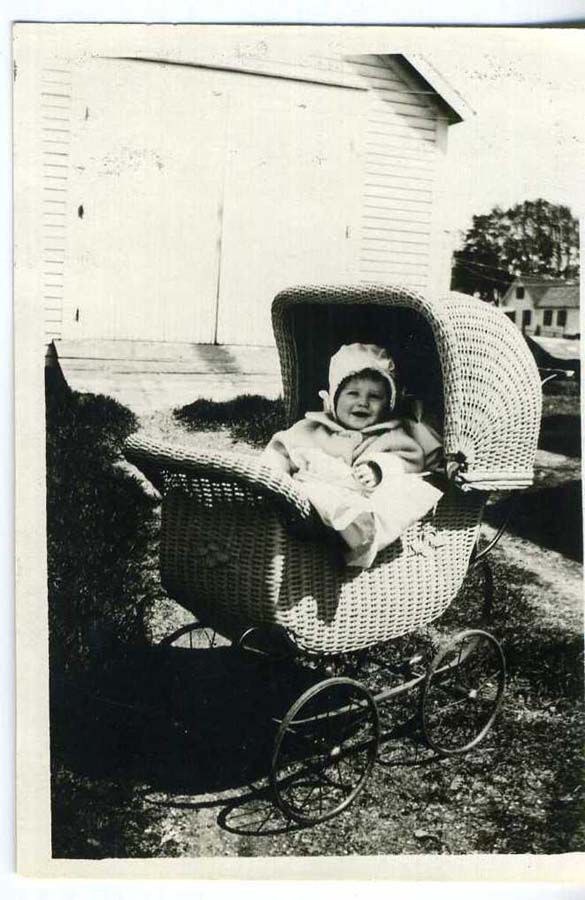 B/W photo of Earle Stimpson as a baby in a wicker baby carriage.