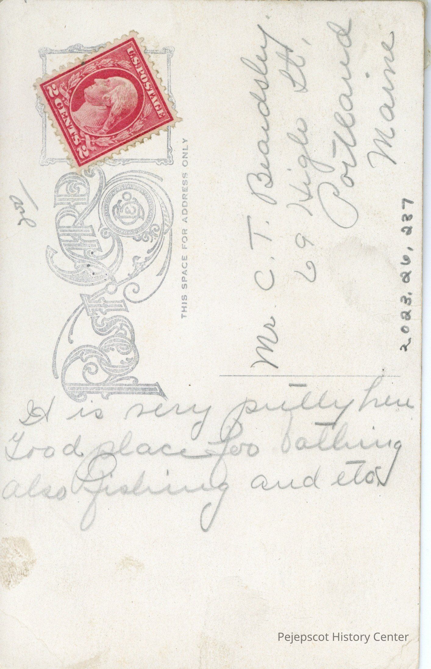 Red two cent postage with Thomas Jefferson's profile.Addressee