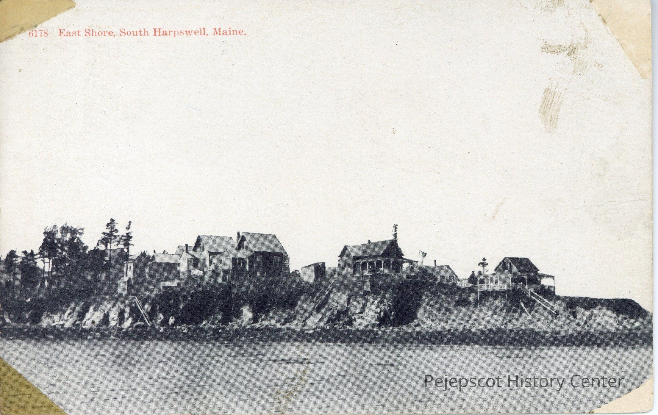 Black and white photo postcard of houses along the East Shore, Harpswell, Maine.Collection