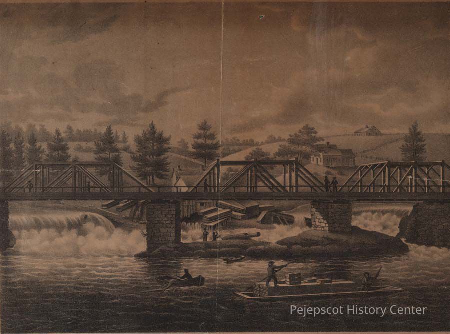 A B/W lithograph titled, "East View of Brunswick Falls, Maine" in 1828. Brunswick, Maine
