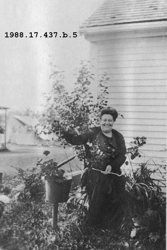 An undated black and white photograph of Edith Stover. She is outside a building and appears to be gardening.