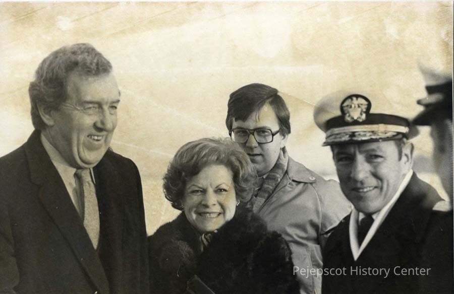 An undated black and white photo of Edmund Muskie, Jane Muskie, an unidentified man, and Cmdr. Paul Mulloy (1930-2016), of Brunswick Naval Air Station. ca. 1980. (Muskie was Maine Senator from 1959-1980, then Secretary of State under President Jimmy Carter from 1980-81.)Collection