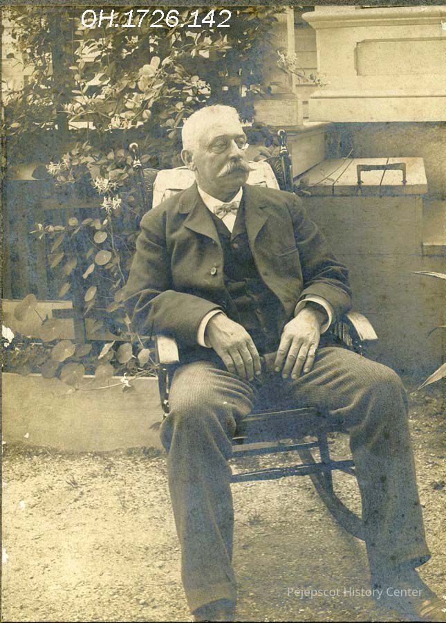 Edward H. Woodside was born at Bunganuc 21 Mar 1847, son of Capt. William and Catherine (Chase) Woodside. For more than 40 years he was proprietor of a livery and sales stable next to Brunswick, Maine's central fire station. He also served as a fire warden and was a member and officer of the former Kennebec Engine Company. After his retirement he was active in the management of Pine Grove Cemetery, of which he was a trustee. He died 01 May 1928 and is buried in Pine Grove Cemetery. Photo not dated.