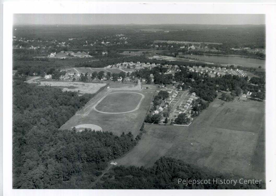 An aerial photo taken on August 13, 1956 of Edwards Field showing housing in the background and Minot Corporation land bought from Otto Rossner.