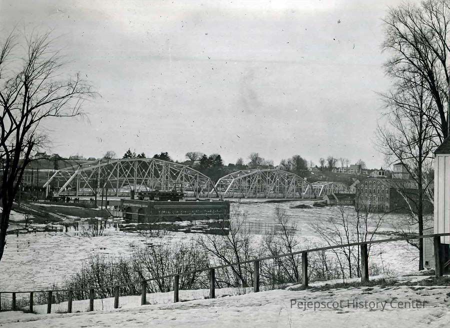 A B/W photograph of the Frank J. Wood Bridge and the flooded generating station in Topsham during the 1936 flood.