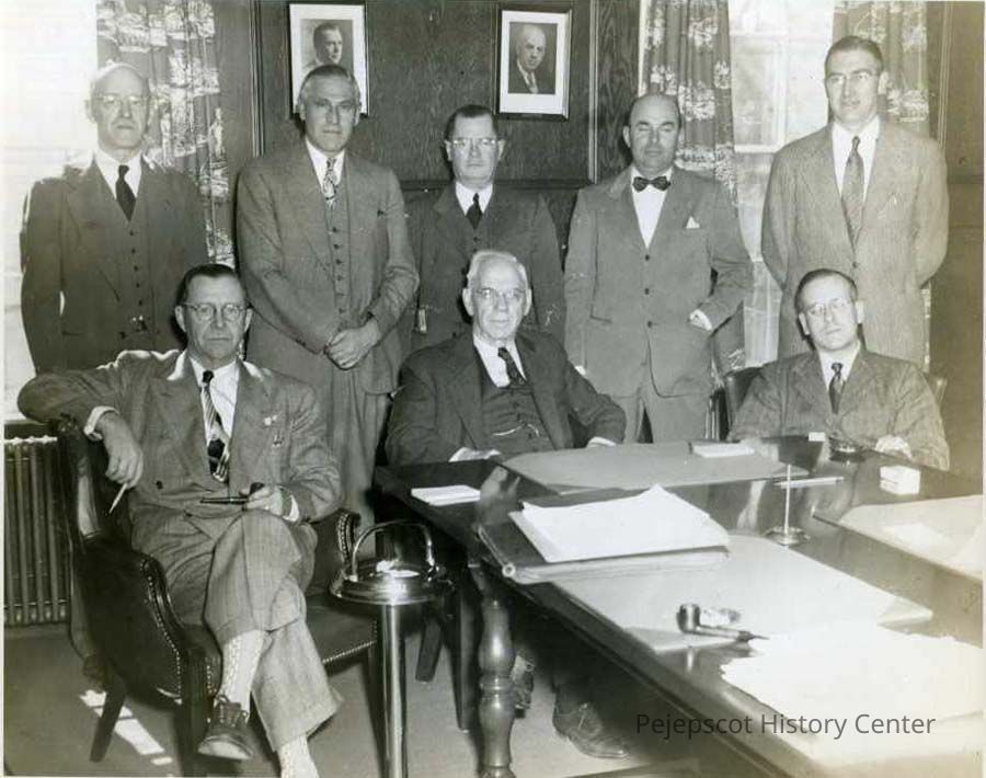 A B/W photograph of eight men. They are John Jack, Herbert Ross Brown, Mr. Farrar, Edgar Comee, Mr. McDuff, Henry Baribeau and Adam Walsh.