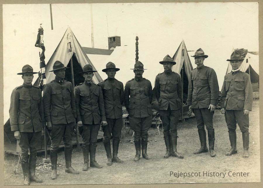 A B/W photo of eight soldiers in front of a tent. Looks like WW I uniforms. William Peterson, 2nd from right.