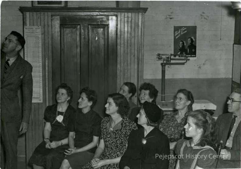 A B/W photograph of eight women watching an instructor at the Red Cross. The women include, Eugenie Menard LeBourdais, ? Ouellette, Mrs. Sawyer, Mrs. O'Brien & daughter, Mrs. Morgan Cushing, Malcomb O'Brien, and Maxwell Sawyer is the instructor. UndatedCollection