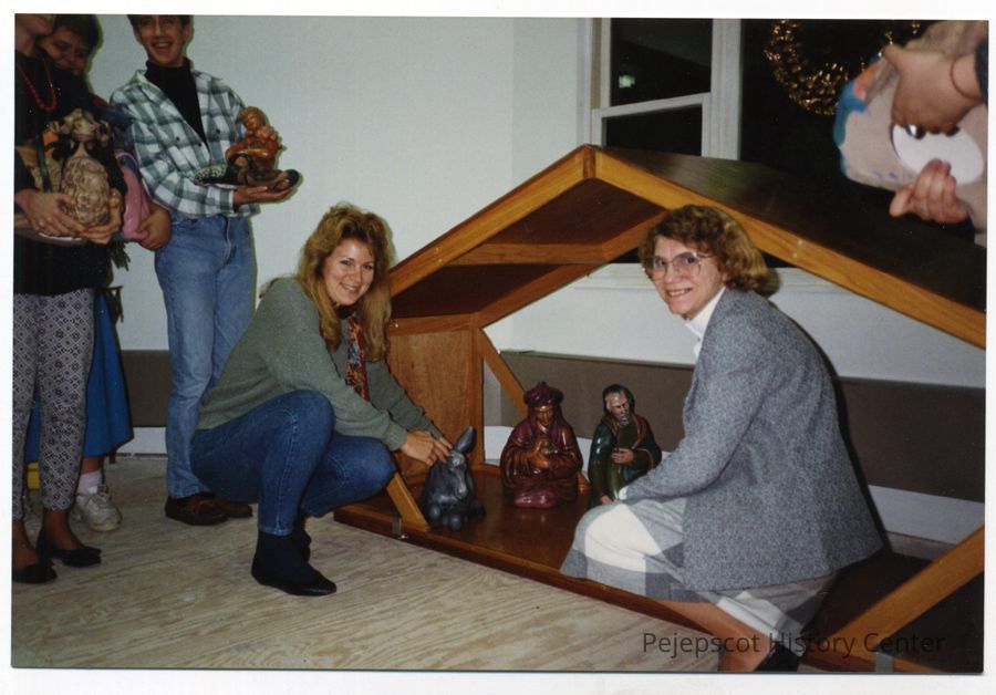 Christmas decoration of Brunswick, Maine, Methodist Church, 1988, Elaine Sells (rt), Helena Scarponi (left).