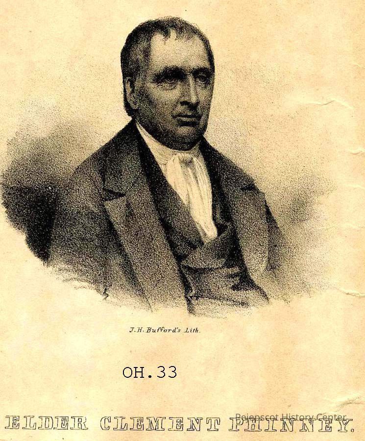 An undated B/W lithographic portrait of Elder Clement Phinney, Free Baptist Minister. Lithograph by J. H. Bufford.