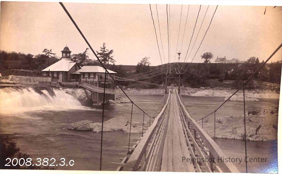 A B/W photograph of the "Electric Light Station" in the Androscoggin River. The foot bridge to the power station can be seen. Undated