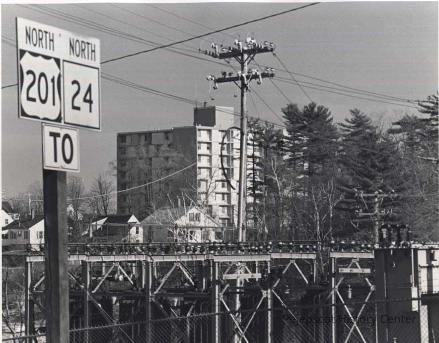 A B/W photograph of an electrical sub station on Bowdoin College campus. Undated