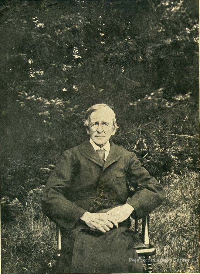 A black and white photo of Elijah Kellogg seated outdoors at his North Harpswell, Maine home. Undated.