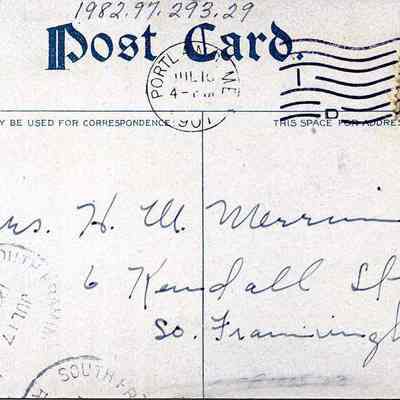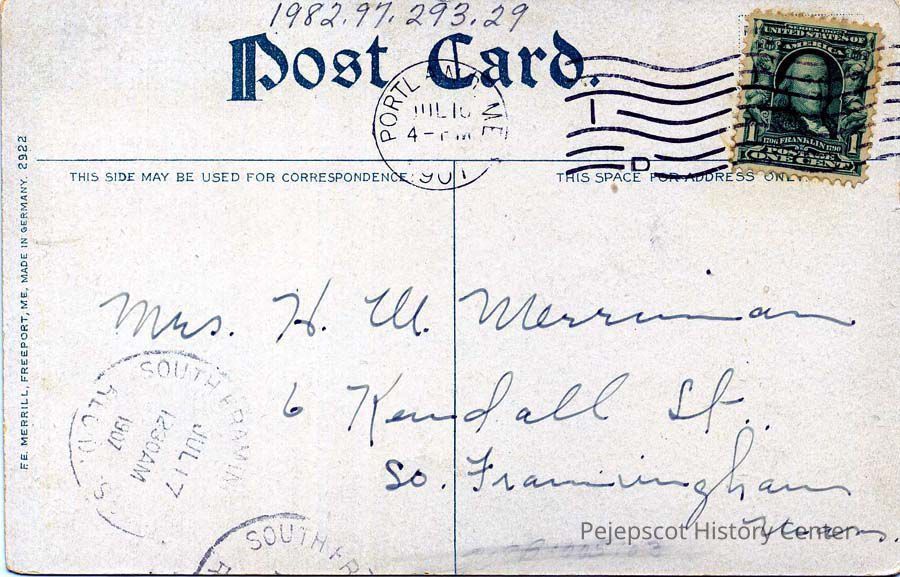 Color postcard of the Elijah Kellogg Church in Harpswell, Maine. To: Mrs H.M. Merriman, 6 Kendall St., Framingham, Mass. Postmarked Portland, July 16, 1907. No message.Lexicon