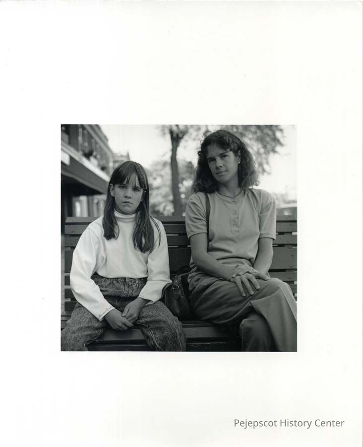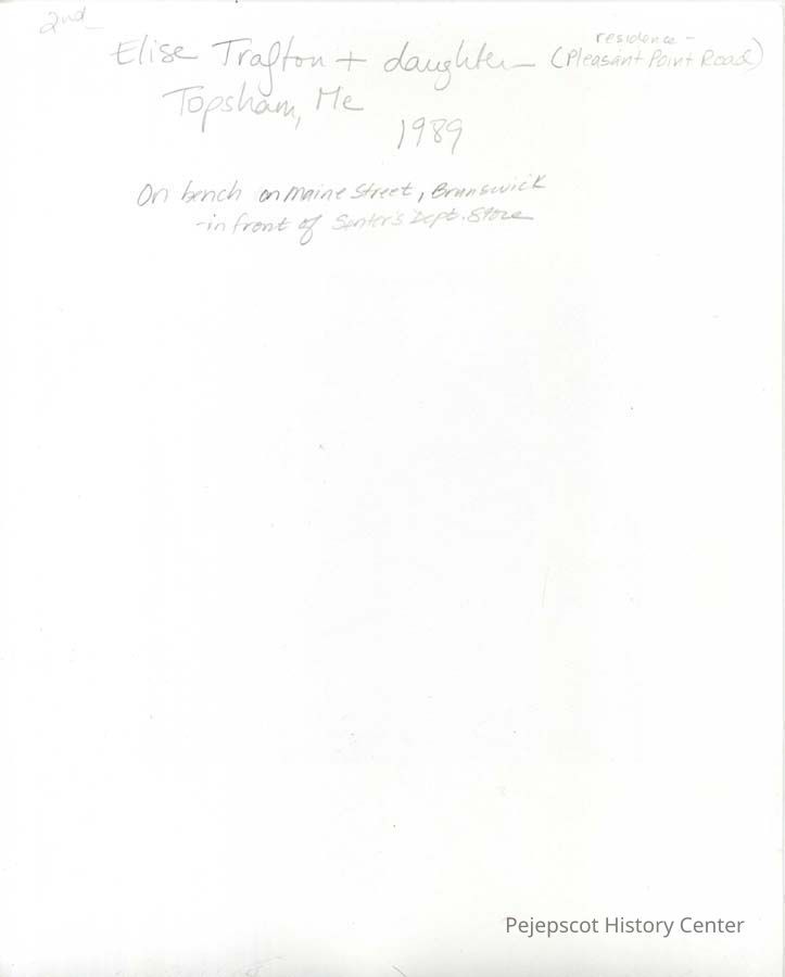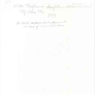 A black and white photograph of Elise Trafton and her daughter, who resided at Pleasant Point Road, Topsham, ME. The photograph was taken on the bench in front of Senter's Department Store on Maine Street, Brunswick.