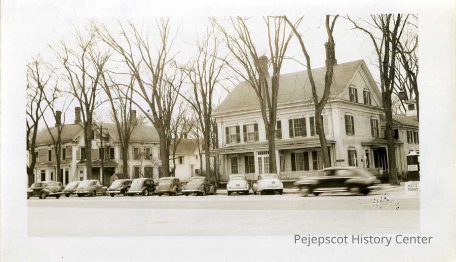 A black and white photo of the Dr. Gilbert Elliot House at 152 Maine Street (on the right, which stood on the corner of Pleasant & Maine Streets) and the house at 156 Maine Street (on the left), owned by M. Phillips Mason from 1920 to 1947.