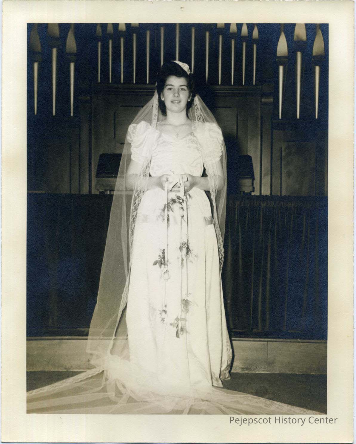 A photo of a bride standing in front of a church organ. The back of the picture identifies her as Pauline Elliot but she may actually be Alta Elliot who married John Chandler on December 19,1943. Undated