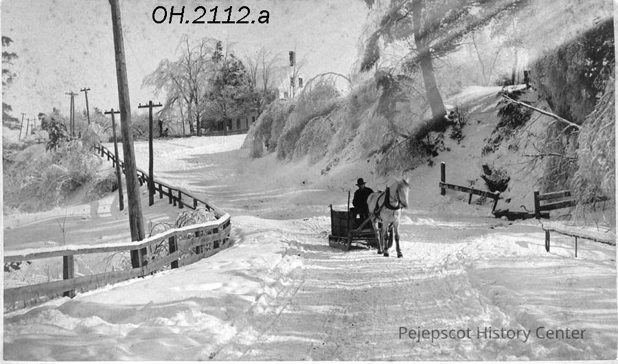 A horse and cart come down Elm Street, Topsham, ME near the watering trough. They are beyond the fairgrounds. The photo was taken after the ice storm of April 2, 1887.