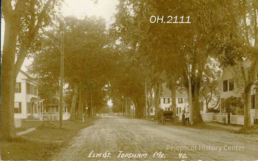 A B/W picture postcard of Elm Street, Topsham, ME. Not dated.