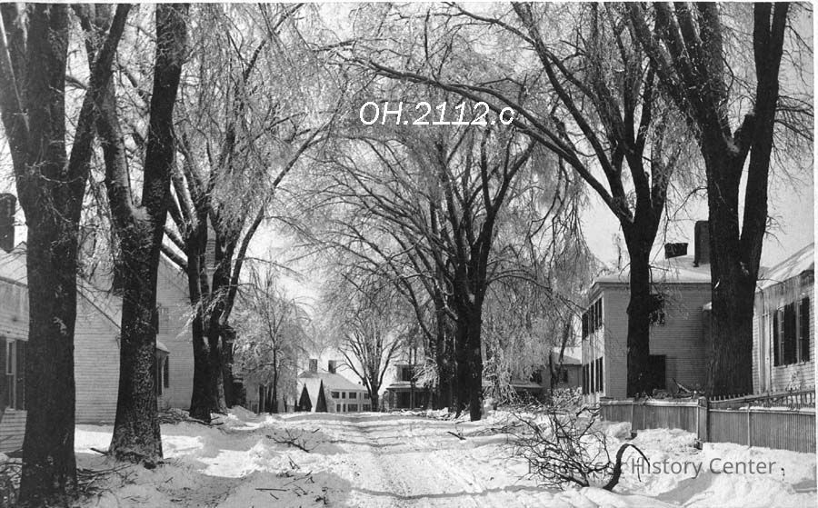 A B/W photograph of Elm Street, Topsham, ME after a storm. The photo was taken after the ice storm of April 2, 1887.