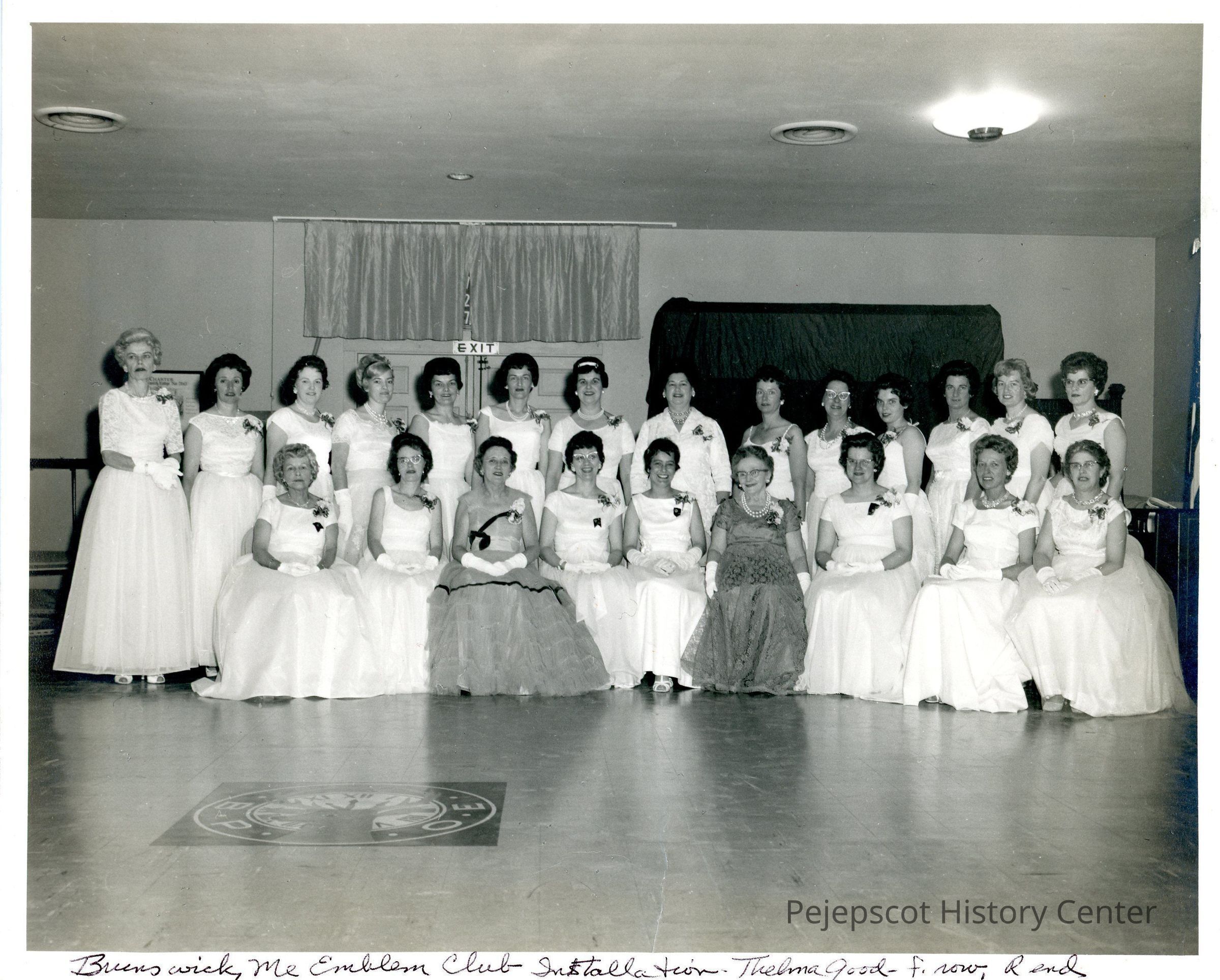Emblem Club, Brunswick Installation: Thelma Good. An 8" x 10" black and white photograph of 23 women in evening gowns, with corsages. Thelma Good is identified as being in the front row, on the right.