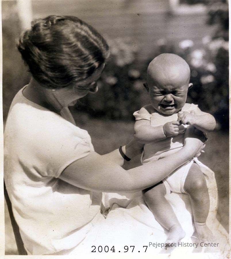 A b/w photograph of a mother holding a baby, Emerson Zeitler. The baby is crying. Bruddy was a nickname for Emerson Zeitler.
