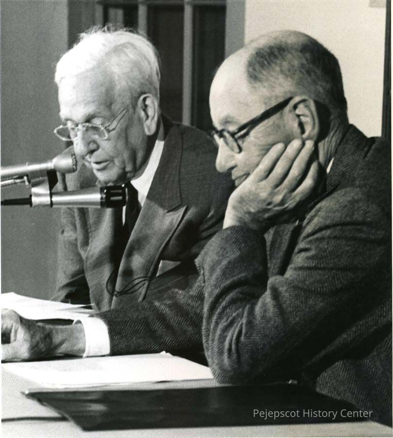 A B/W photograph of Emery Booker (l) and John Baxter (r) during informal talks ar Varney Hall . 06/1978
