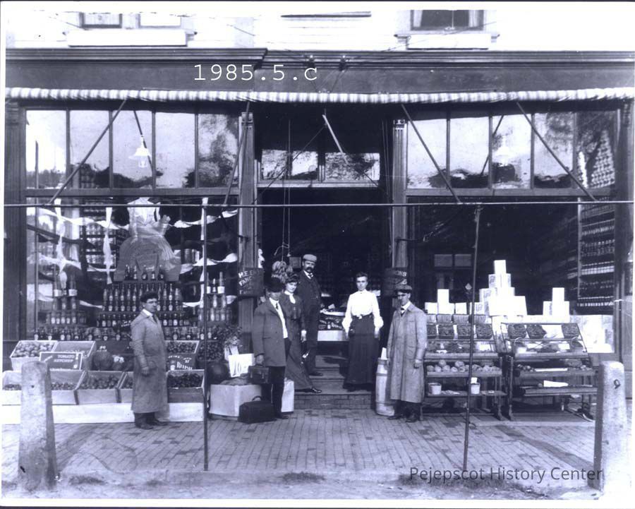 A B/W photograph of the store front of Emmons Grocery Store; several people are standing on the steps and sidewalk. Located in the Odd Fellow's Block (now the Tondreau Block) on Maine Street in Brunswick, Maine, the store was purchased by the Tondreau Brothers in 1906. The building was destroyed by fire in January 1926.