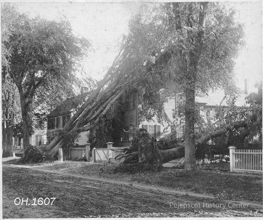 A B/W photographic view of the Barrows-Longfellow-Emmons house at 25 Federal Street, Brunswick, ME. The wind storm of June 14, 1892 uprooted trees that damaged the house and fence.