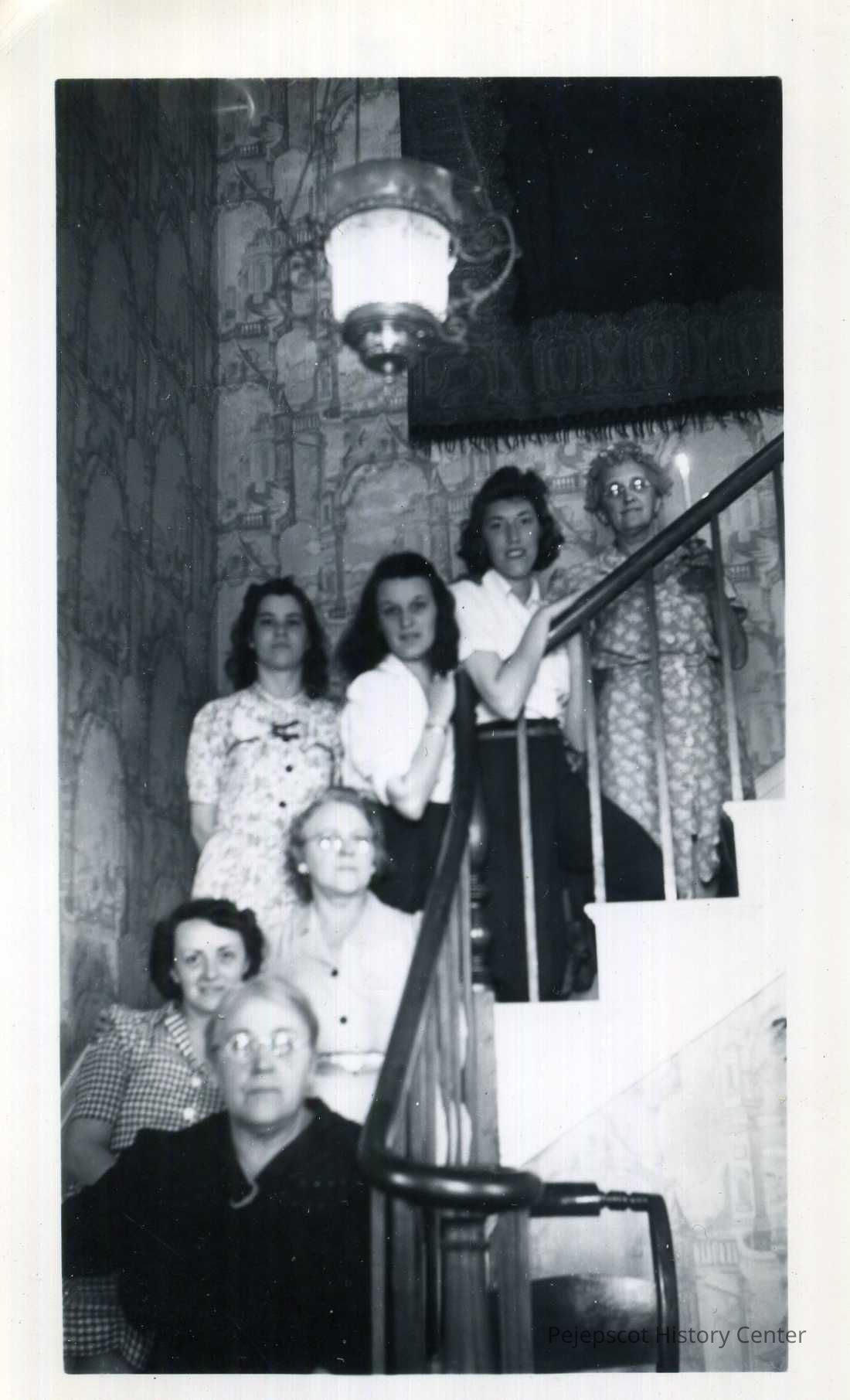 A black and white photograph of employees of Brehaut's Store at Mary Lilly's farm in Bowdoinham in 1948. The employees are (from the bottom up): Mrs. Hosmer, Rose Fournier, Gladys Burns, Alice Purington, Estelle Metivier, Annette Bonang and Mary Lilly.Lexicon