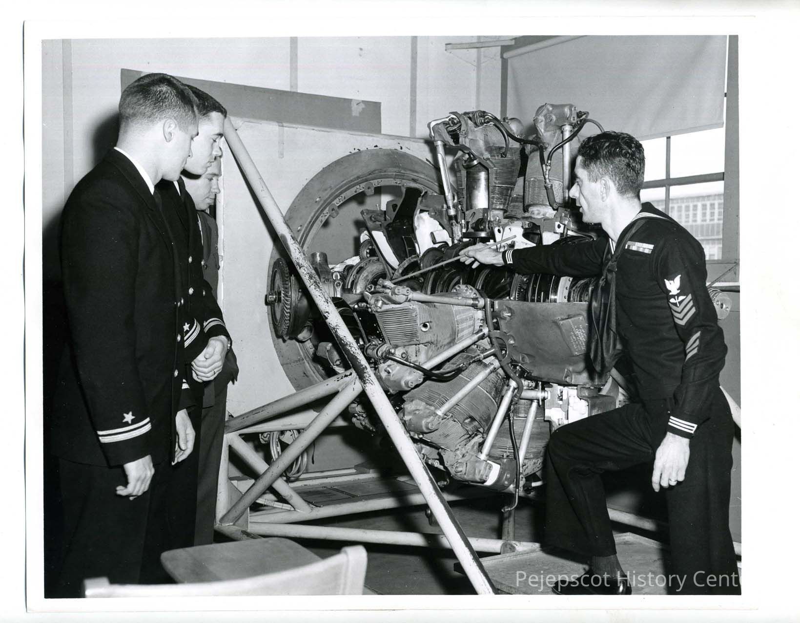 "J. Kalian, AD1, explains the different parts of a reciprocating engine cut-a-way model to LT.JG-W.T. Flynn, LTJG J.L. Nutty, and LTJG R.B. Berg all of VP-7." The back bears three stamps "U.S NAVAL AIR STATION BRUNSWICK, MAINE", "OFFICIAL PHOTOGRAPH NOT TO BE USED FOR PUBLICATION UNLESS OFFICIALLY RELEASED", and "RELEASED IF PUBLISHED CREDIT MUST BE GIVEN AS FOLLOWS 'OFFICIAL PHOTOGRAPH U.S. NAVY.'" UndatedLexicon