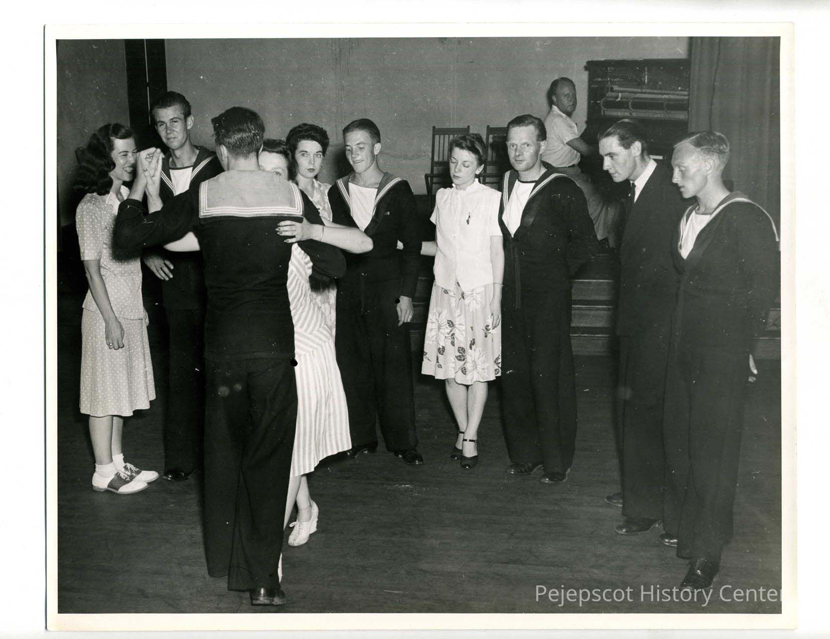 A group of English sailors and town girls at a dance possibly in the Town Hall. Bunny Stanwood is at the piano. The woman dancing and in partial view is Camille St. Pierre. Her father was a dance instructor. Undated