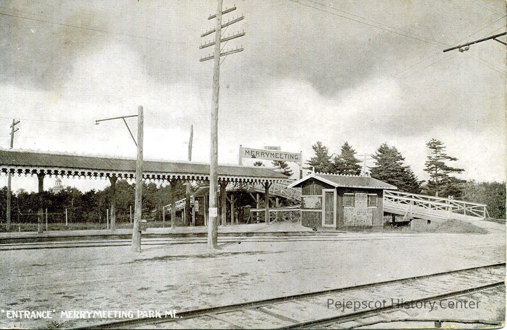 "Entrance," Merrymeeting Park, ME. Sepia postcard, on light cardstock, showing open pavilion, closed shed, incline ramp, railroad tracks. Painted sign, "1898 / Merrymeeting" overhead.