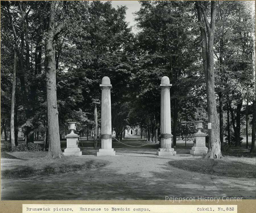 A black and white photograph of the entrance to Bowdoin College campus. Marking the entrance are columns on either side with a chain hanging between them. Each column has a statue of a vase on top of a pedestal next to it. Between the columns is a path lined with trees that leads to what is now the Visual Arts Center/Kresge Auditorium. Undated