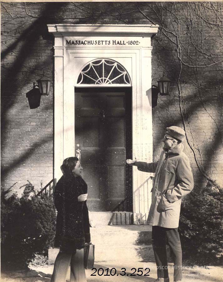 A B/W photograph of William D. Shipman pointing to the entrance to Massachusetts Hall. Photo published 2/5/1974. Undated
