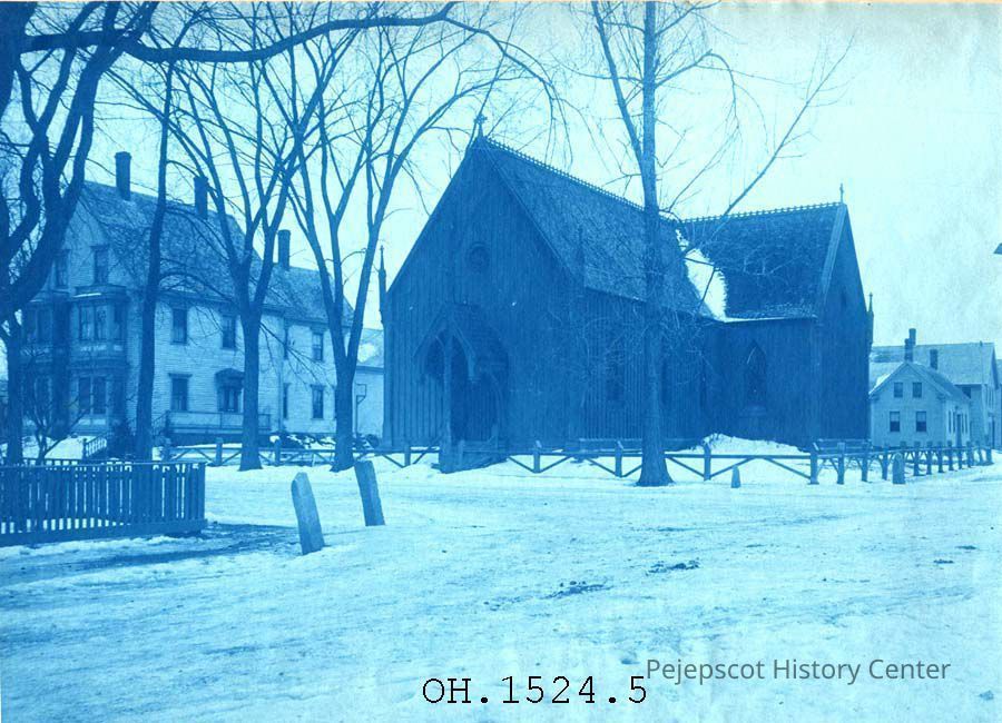 A B/W photograph of the Episcopal Church, Pleasant Street, Brunswick, Maine. Dated 1898.