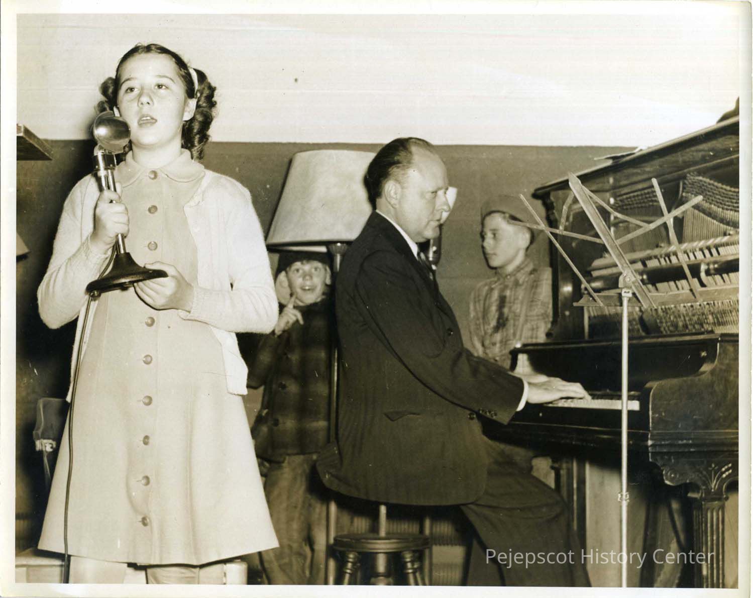 Ernest "Bunny" Stanwood playing the piano for a young girl singing while holding a mic. He played in the Cumberland Theatre in the early 1920s. Undated