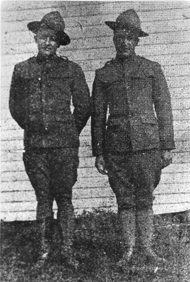 A B/W photograph of Ernest F. and John Benoit, privates, 1st Class, Battery E, 103rd Regiment, Field artillery, Allied Expeditionary Force. John Benoit was wounded in action during WW I. Formerly volunteered with 10th Company Brunswick National Guard Unit (CBNG). Photo is undated.