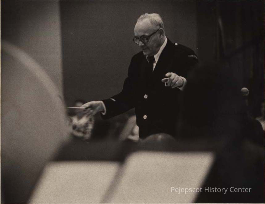 A black and white photo of Ernest W. George, who was retiring as Brunswick High School band director, conducting the final number of the 1976 band-o-rama program. The photo was published in The Times Record in Brunswick, Maine, on 3/12/1976.