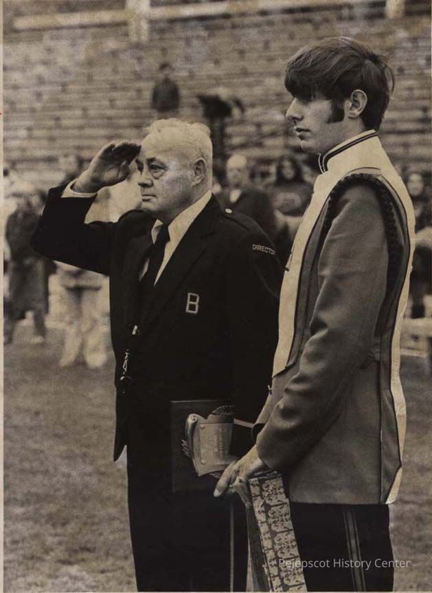 A black and white photo of Brunswick High School Band Director Ernest W. George and band president Dominic D'Alessio, during a recognition ceremony for George, who had been band director for 20 years. The photo was published in The Times Record in Brunswick, Maine, on 11/12/1975.Collection