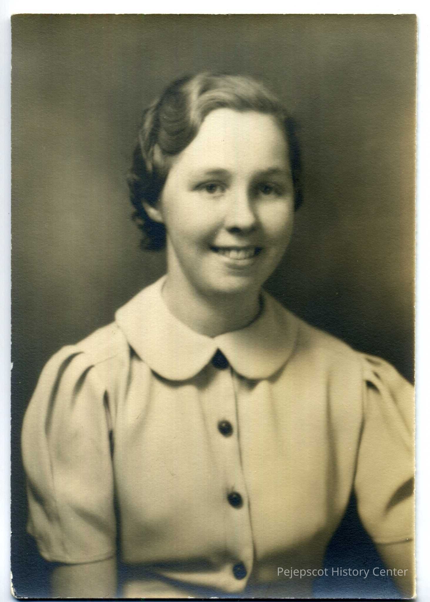 A black and white photograph of a woman identified as Eva White (Richards) (BHS Class of 1937), daughter of Ralph and Eva White of Topsham.