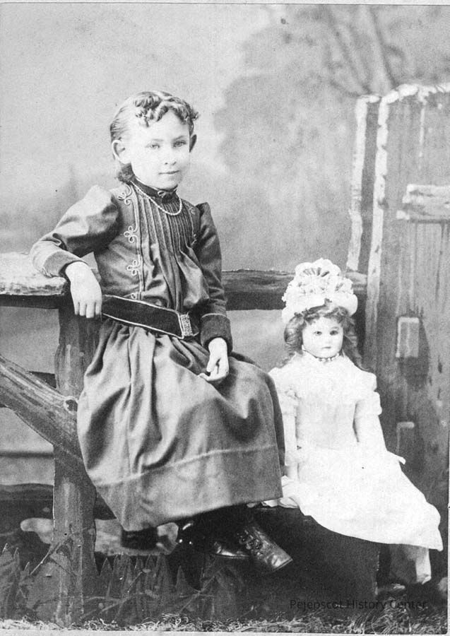 A B/W photograph view of Eva Woodward and her doll, Rosabel. Eva's mom was a sister to Mrs. J.W. Pennell (Hattie Simpson), Eva and her mom lived in Brunswick, ME with Hattie. Undated.Collection