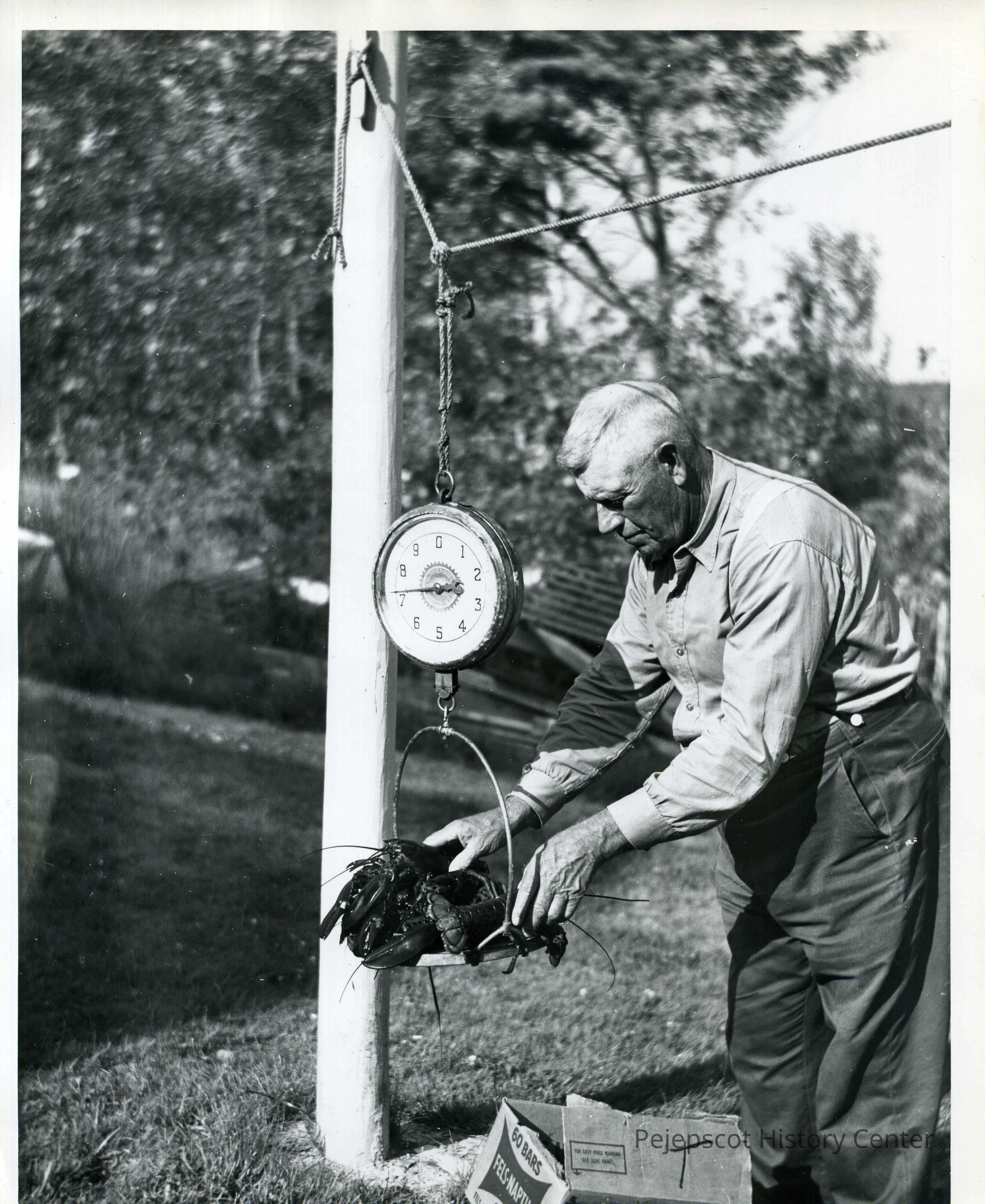 B/W photo of Everett Getchell of South Harpswell, weighing lobsters. No date.
